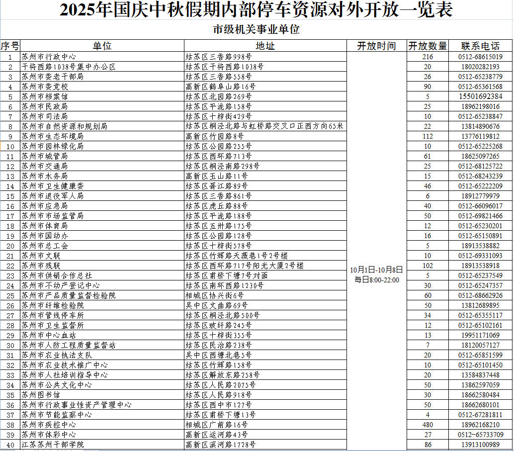 今年国庆中秋假期,苏州全市353家机关企事业单位内部停车场、约3.5万个停车位向社会免费开放,为假期出行“减负”。
