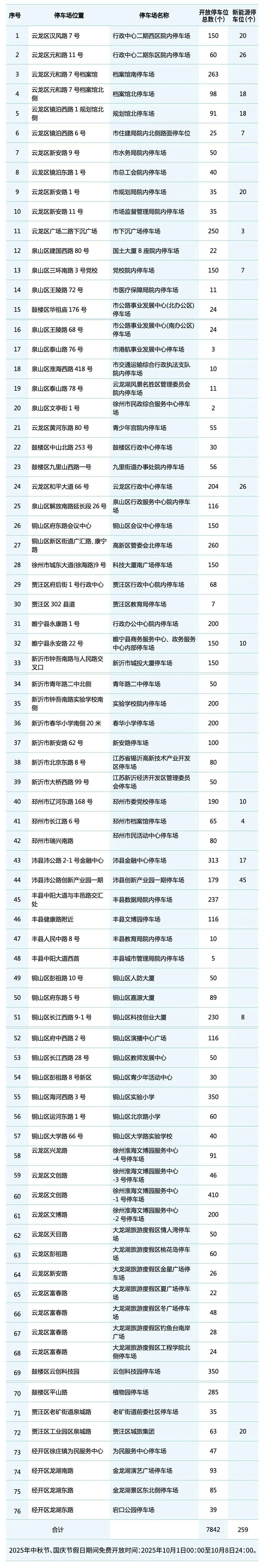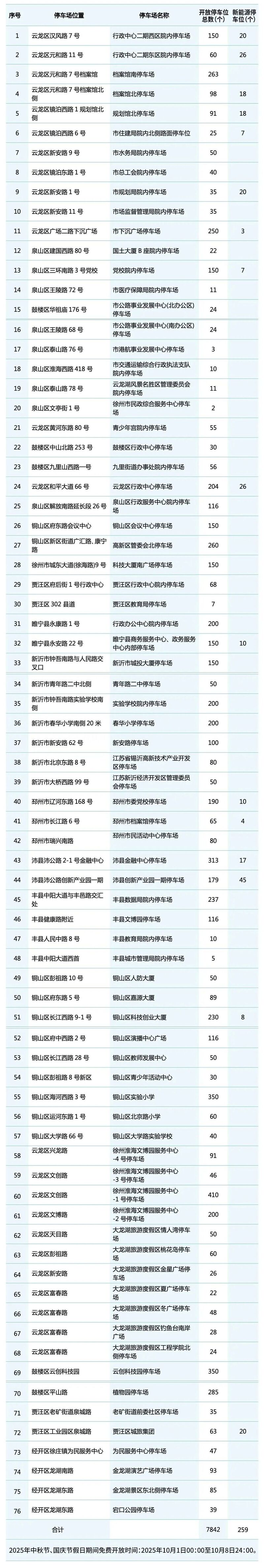 为有效缓解节假日“停车难”,方便市民游客出行停车需求,国庆、中秋长假期间,徐州市多个党政机关企事业单位内部停车场、部分公共停车场免费向社会开放。
