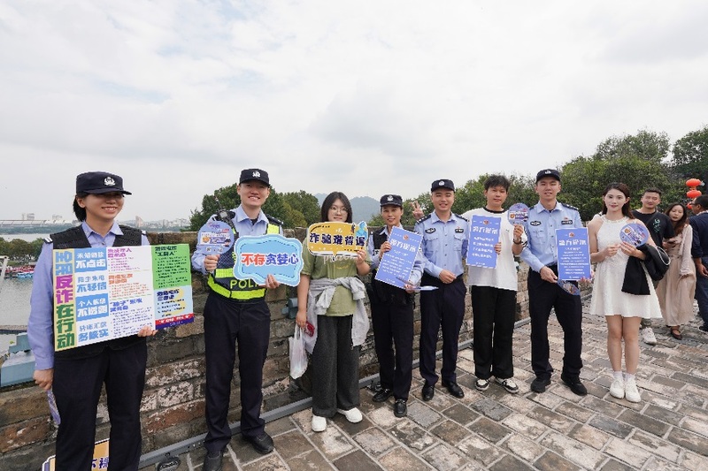 “各位游客,游玩开心之余,别忘了守护好自己的钱包,陌生链接不要点,可疑电话要警惕……”玄武分局民警在玄武湖、台城等热门景区开展反诈宣传活动,通过大声朗读反诈提示等互动小游戏,与游客们热情互动。在各大景区入口、商圈广场,民警向来往的市民游客发放反诈宣传单,讲解近期高发的诈骗类型。