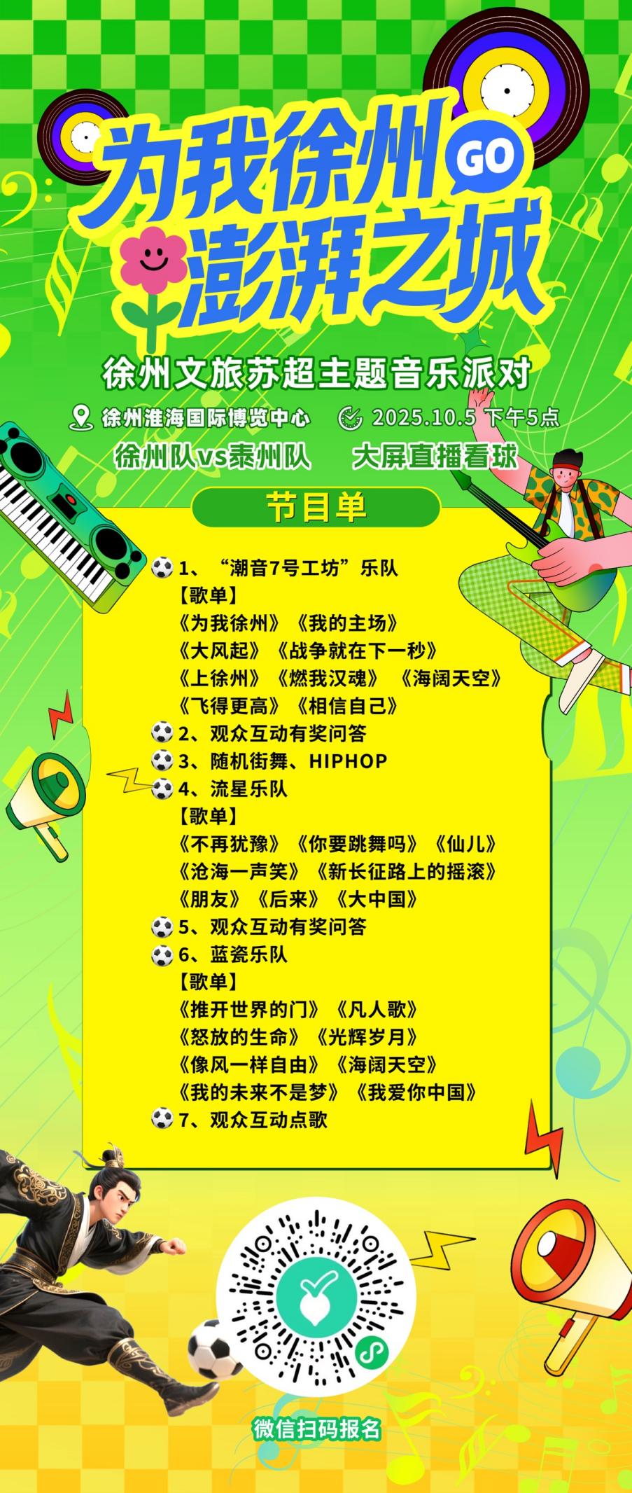 为我徐州,一起澎湃!热爱足球、喜欢音乐、想感受家乡活力的你,赶紧报名吧。再次提醒!10月5日17:00至19:00,淮海国际博览中心“一起看球 8”云龙“第二现场”,咱们不见不散!