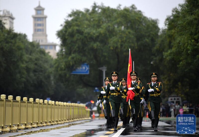 ↑ 10月1日在陕西省西安市新城广场拍摄的升旗仪式。新华社记者 李一博 摄