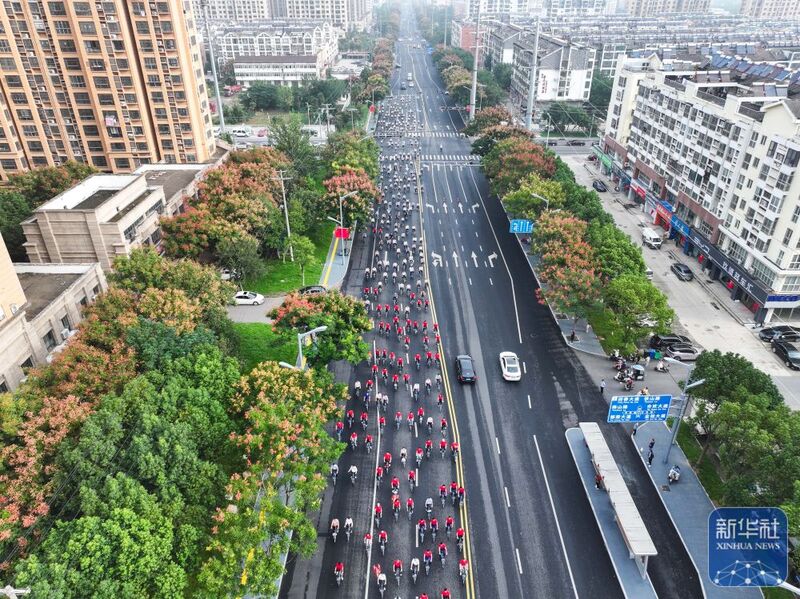 ↑ 10月1日,江苏省淮安市盱眙县举行“共贺祖国华诞”绿色骑行活动,参与者骑车出发。新华社记者 季春鹏 摄