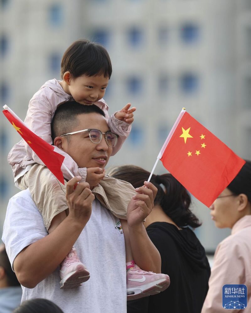 ↑ 10月1日,在河北省石家庄解放广场,小朋友在家长陪伴下参加升旗仪式。新华社发(梁子栋摄)