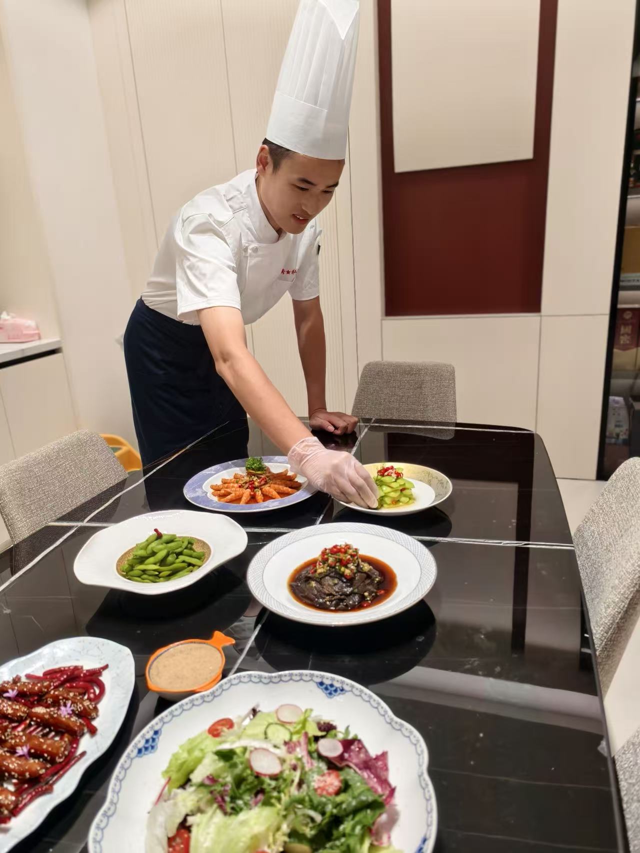 锅里起油、煸香姜蒜、滑入肉块……一个多小时后,竹荪乳鸽海参汤、牡丹虾球、酒香红烧黑豚肉、蒸松叶蟹等20道菜陆续上桌。这时,杨小刚直起腰,擦了擦额头上的汗。