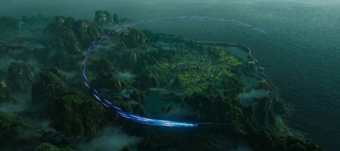 影片中,哪吒的家乡陈塘关作为故事的主要发生地,见证了哪吒的成长变化。充满奇幻色彩的陈塘关风光,设计时借鉴了广西桂林的山水景观。