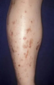 也叫胫前糖斑,表现为小腿前侧出现边界清晰的褐色斑块,不痛不痒,是糖尿病比较特异的皮肤病变。
