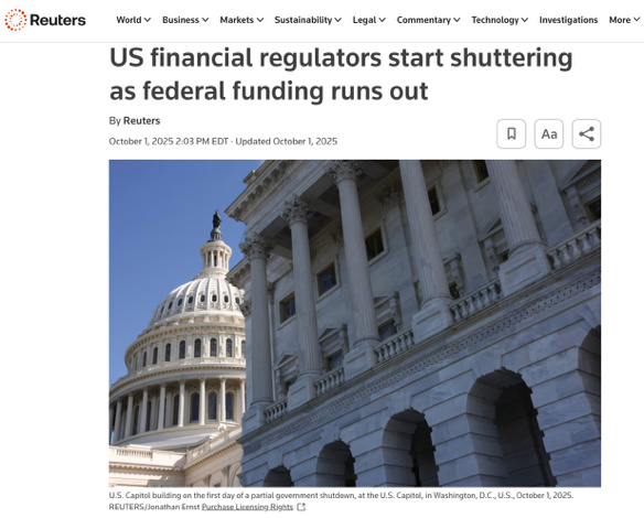 据路透社报道,这次停摆中,美国证券交易委员会(SEC)按应急预案让超过90%的员工停工,仅保留极少人手维持紧急执法与市场监测,同时,期货交易委员会(CFTC)也大幅缩编,仅保留大约5.7%的人员维持基本功能。