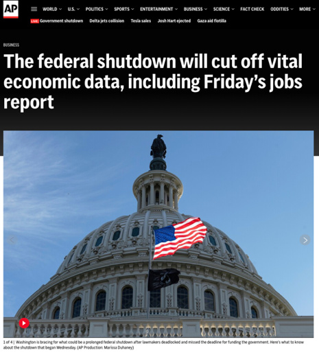眼下最为现实的就是,美国劳工部原计划10月3日发布的月度就业报告,如今面临着被迫取消的窘境,而10月28日联储将召开例会决定利率政策,如果没有该报告提供劳动力市场走向的专业数据,联储的政策制定将失去重要决策参考。美联社报道称,政府关门正在切断劳工统计局的数据发布能力,这让美联储在10月会议上“看不见路”,失去判断依据。