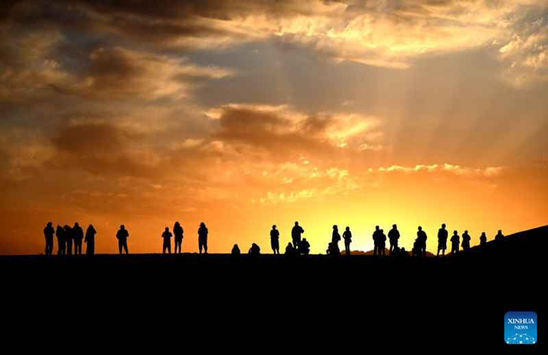 Tourists enjoy the sunrise over the desert at the Mingsha Mountain and Crescent Spring scenic area in Dunhuang City, northwest China's Gansu Province, Oct. 2, 2025. With China's Mid-Autumn Festival falling alongside National Day this year, people spend their leisure time through various ways during the eight-day holiday. (Photo by Zhang Xiaoliang/Xinhua)