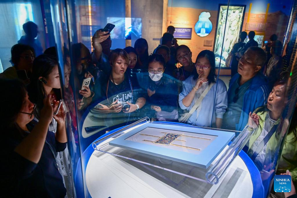 People view an exhibit at Xinjiang Museum in Urumqi, northwest China's Xinjiang Uygur Autonomous Region, Oct. 2, 2025. With China's Mid-Autumn Festival falling alongside National Day this year, people spend their leisure time through various ways during the eight-day holiday. (Xinhua/Ding Lei)