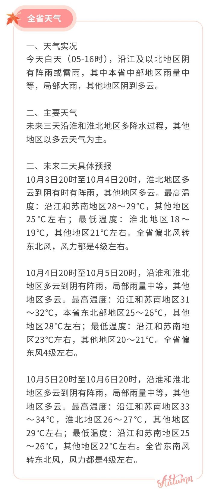 10月5日20时-10月6日20时,沿淮和淮北地区多云到阴有阵雨,局部雨量中等,其他地区多云。最高温度:沿江和苏南地区33~34℃,淮北地区26~27℃,其他地区29℃左右;最低温度:沿江和苏南地区25~26℃,其他地区22℃左右。全省东南风转东北风,风力都是4级左右。