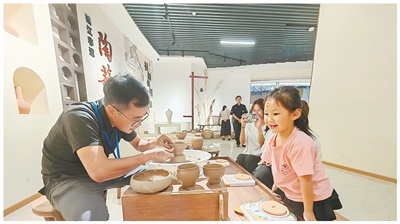 包茂高速广东茂名柏桥服务区开通运营后,吸引众多游客。图为在服务区内的非物质文化遗产展示馆,游客近距离观看非遗技艺。 本报记者贺林平摄