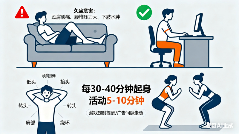居家娱乐需警惕“久坐危害”。长时间坐着追剧、打游戏,容易导致颈肩酸痛、腰椎压力增大,还可能影响血液循环,增加下肢水肿风险。建议每坐着30—40分钟起身活动5—10分钟,做简单的颈肩拉伸动作,如低头、抬头、左右转头,肩部绕环;也可做深蹲、踮脚等动作,活动下肢。同时,调整坐姿,保持背部挺直,膝盖与臀部同高,避免弯腰驼背或瘫坐,减少对脊柱的压力。若喜欢打游戏,可设置“定时提醒”,避免因沉浸其中忘记起身;追剧时可在广告间隙起身走动,倒杯水、整理房间,让身体得到放松。