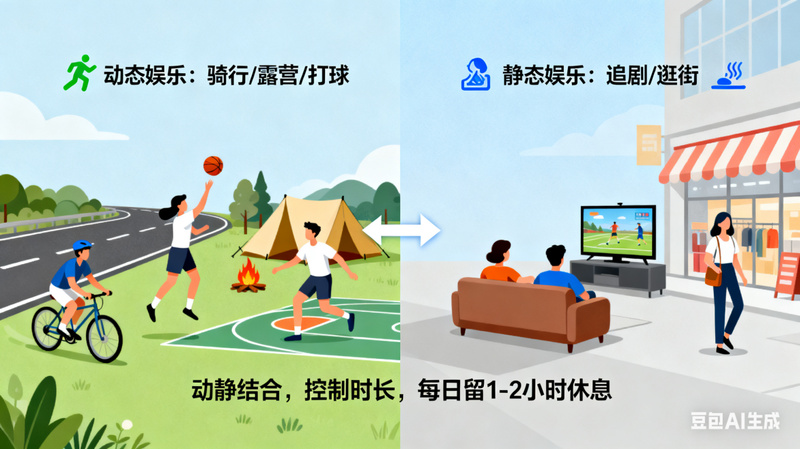 此外,娱乐活动需“动静结合”。除了追剧、逛街等轻度活动,可适当安排户外娱乐项目,如骑行、露营、打球,既能锻炼身体,又能呼吸新鲜空气,缓解久坐、熬夜带来的疲劳。同时,注意控制娱乐时长,避免一天内安排过多活动,留出1—2小时的休息时间,让身体有足够的恢复时间。