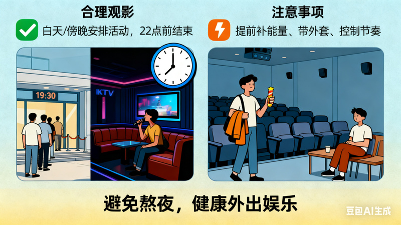 外出娱乐需合理安排时间,避免熬夜。不少人会选择晚上外出看电影、逛夜市、参加派对,容易导致熬夜。建议提前规划活动时间,尽量将主要娱乐活动安排在白天或傍晚,晚上10点前结束,避免超过12点回家。若参加夜间活动,需提前补充能量,避免空腹,同时携带外套,防止夜间降温着凉。活动过程中注意控制节奏,避免过度兴奋,如逛夜市时不要长时间站立,可适当找地方休息;看电影时选择中间位置,减少颈椎长时间后仰或前倾。