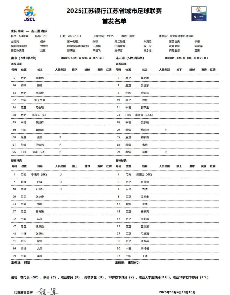 10月4日晚,“苏超”淘汰赛首场1/4决赛将在南京奥体中心体育场打响,南京队坐镇主场迎战远道而来的连云港队。