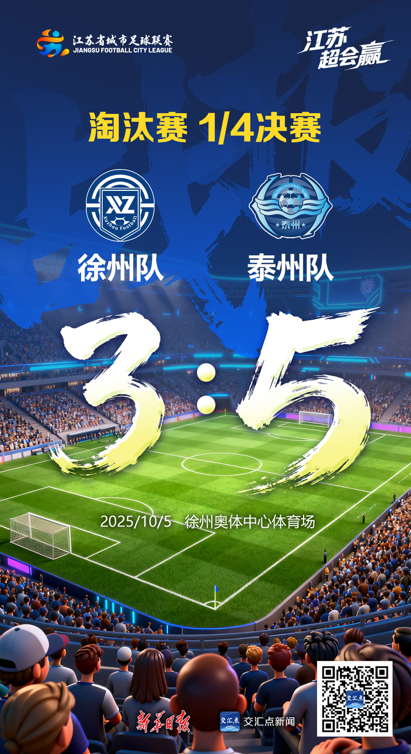 交汇点讯 10月5日19:35,“苏超”联赛四分之一决赛第二场,泰州队客场在徐州奥体中心体育场挑战徐州队。经过90多分钟的鏖战,在30336名观众的见证下,泰州队点球大战中四罚四中,最终5比3力克徐州队,晋级四强。
