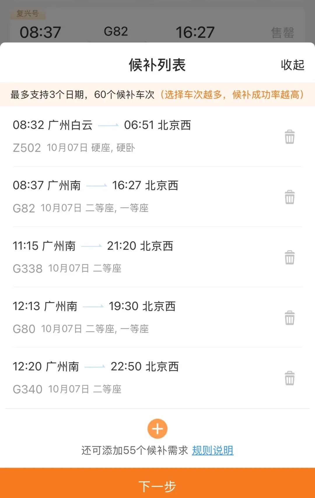 候补列表展示已选候补车次和席别,点击“下一步”进入确认候补订单页面。