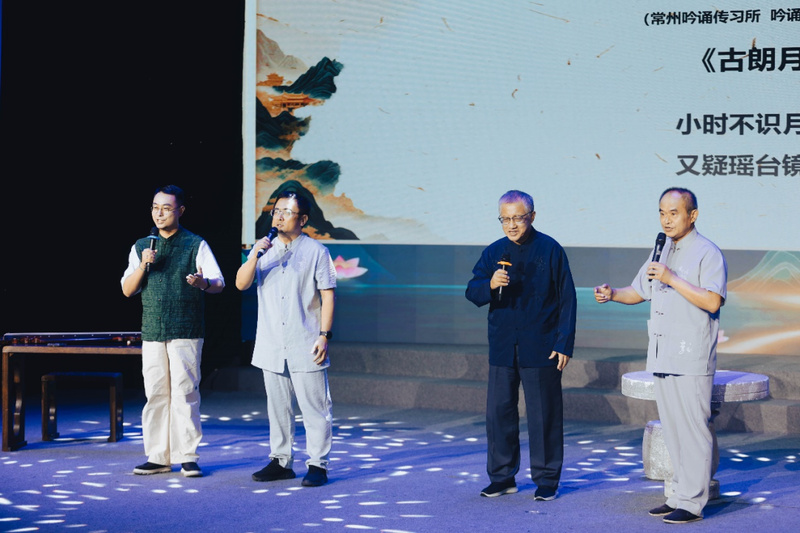 多位常州吟诵市级代表性传承人相继登台,以各具风骨的经典篇目,集中展现了这项国家级非物质文化遗产的艺术魅力与深厚底蕴。盛杨以《归园田居·其三》诠释陶渊明的返璞归真;吴文娟借《题菊花》抒发高洁志趣;顾勤元演绎的《将进酒》洒脱激昂,尽显诗仙风骨;柳飞在《宣州谢朓楼饯别校书叔云》中寄托豪迈情怀;楼益华以深沉悠远的《旅夜书怀》,再现杜甫“星垂平野阔”的苍茫气象;胡进中在《江·山·月》中巧妙融合李白边塞豪情与杨慎历史哲思,意境雄浑;张翔演绎的《琵琶行》情韵深长,令人回味。来自传习所的朱敏、秦晓正、常海欣、王丽萍、何辰一、姚达、蒋为民、秦晓正、王子轩、朱易、程颖珊等师生也纷纷登台,以声传情,以诵会友,赢得现场阵阵掌声。
