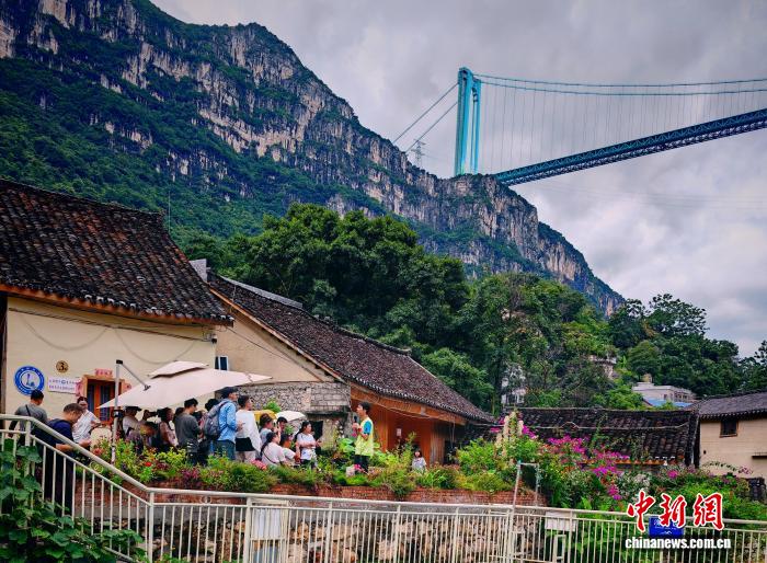 在花江村,记者看到不少游客悠闲地坐在青瓦灰墙的布依族传统民居前品茶观桥,或在村口的路边寻找最佳角度,留下“与大桥同框”的纪念照;更有游客信步走向村边的花江铁索桥,寻找角度拍摄这座曾是黔滇往来要道的古桥,与远处现代工程的杰作形成“新老同框”的独特画面。