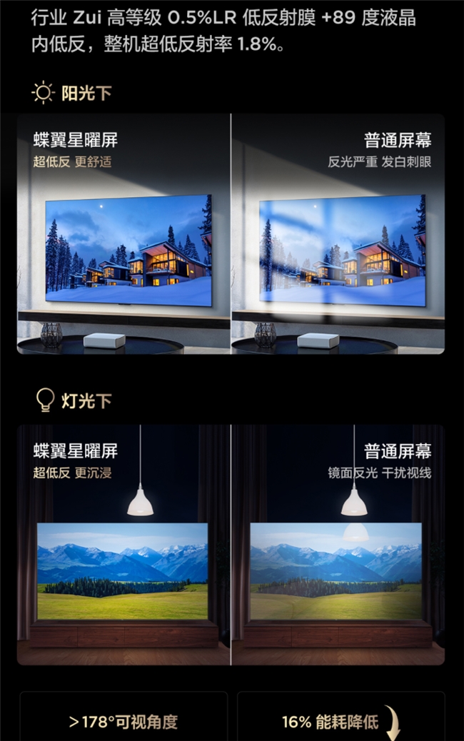 TCL T7L Ultra则完全不同,其搭载华星高阶HVA蝶翼星曜屏,采用了通常高端旗舰机型才会使用的“镜面低反”方案,通过在屏幕外层覆盖行业最高等级的0.5% LR低反膜,结合89度液晶内低反设计,形成内外双重抗反防护,将整机反射率降至惊人的1.8%。这一数据意味着即使在阳光直射的环境下看电视,画面也会始终保持通透清晰,屏幕上不会出现令人头疼的倒影或光斑。