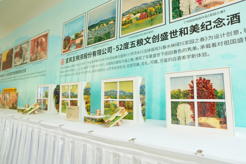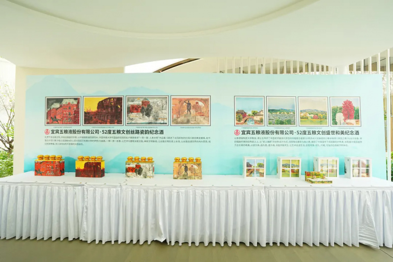 笔会现场,万茗堂精心布置的文化长廊尤为引人驻足。长廊中陈列的五粮液股份系列文化酒——《五粮液股份春夏秋冬月光曲酒》《五粮液股份春夏秋冬盛世纪念酒(花下醉)》《五粮液股份五粮文创丝路瓷韵纪念酒》《五粮液股份五粮文创盛世和美纪念酒》等,以笔触和色彩定格山川风月、四季流转的诗意,以酒水匠心底蕴,为这幅画卷注入了流动的生命与醇香的情感,深度融合酒之灵魂、画之底蕴、瓷之风骨。这些产品是酒,更是流动的绘画、立体的诗。
