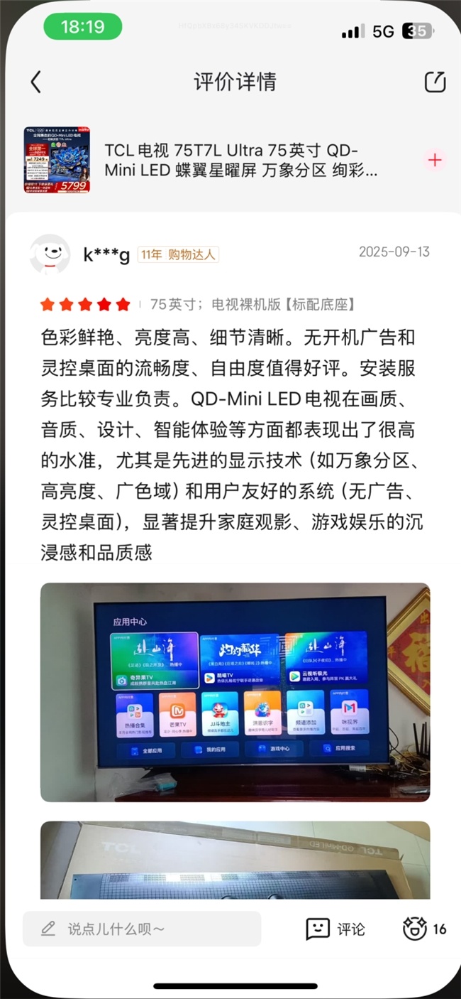 用户的真实反馈也印证了它的实力:“色彩鲜艳、亮度高、细节清晰”,尤其是“无开机广告和灵控桌面的流畅度、自由度值得好评”。正如一位购物达人所评价:“QD-Mini LED 电视在画质、音质、设计、智能体验等方面都表现出了很高的水准。”正是这些出众表现,让T7L Ultra一经上市就供不应求,成为追求沉浸观影用户的一致选择。