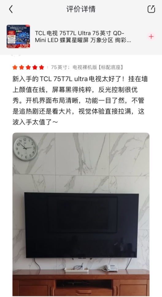 TCL T7L Ultra选择了一条更艰难但更彻底的技术路径——镜面低反方案。其搭载的蝶翼星曜屏,外层覆盖了行业最高等级的0.5% LR低反膜,并创新性地加入了89°液晶内低反结构,这套组合拳将整机反射率压制在惊人的1.8%,远低于AGLR屏常见的2.6%。这微小的百分比差距,带来的却是体验上的天壤之别。它意味着用户终于可以从“迁就环境光”的观影习惯中解放出来。下午在西晒的客厅窗边看电视剧,屏幕上不再有烦人的窗户倒影;晚上开着温馨的暖光灯享受紧张剧情,画面也不会因为灯光而泛白失真。正如一位用户所说的“反光控制很优秀,屏幕黑得纯粹”,这句朴实的反馈,背后是TCL从材料科学到屏幕结构一整条技术链的坚实突破。