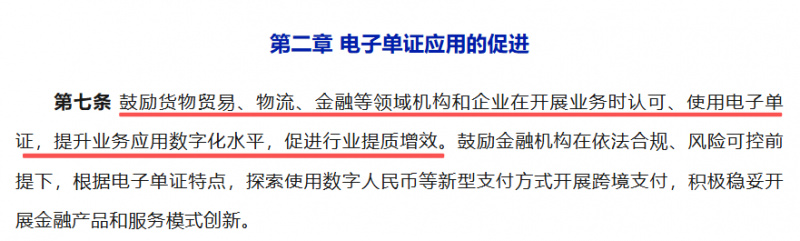而金融领域,征求意见稿中明确,鼓励金融机构根据电子单证特点,积极稳妥开展金融产品和服务模式创新。
