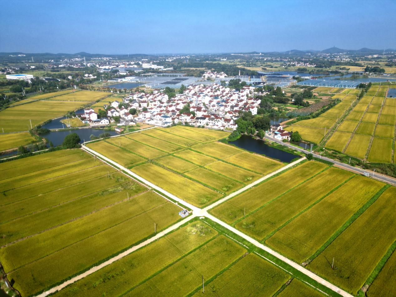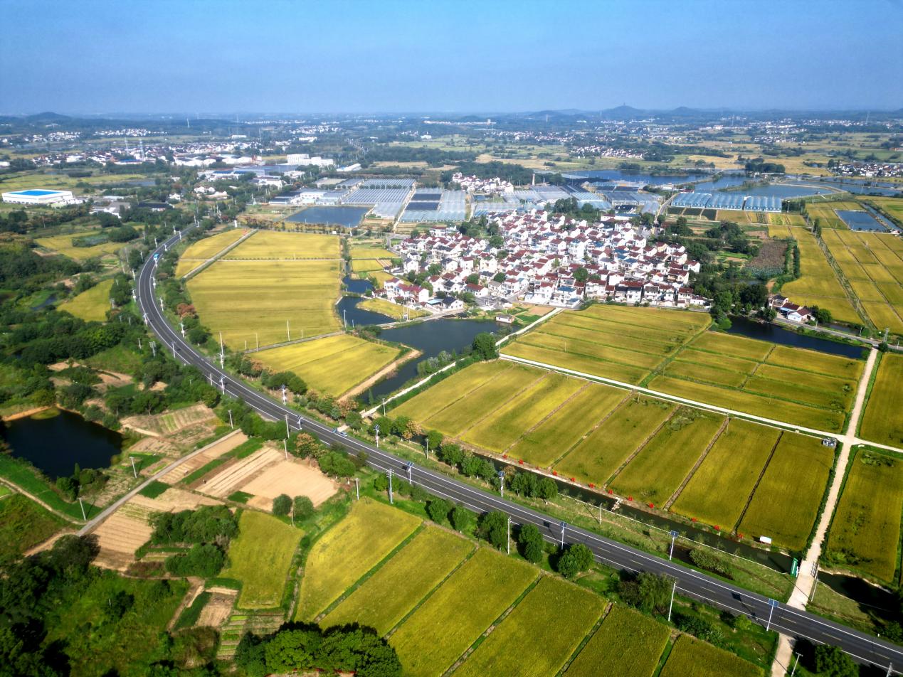 10月9日,航拍高淳区桠溪街道都市现代农业产业示范园区金色的稻田“丰”景如画。