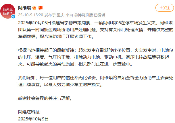阿维塔科技10月9日在官方微博发布声明,就一辆阿维塔06发生火灾进行回应。