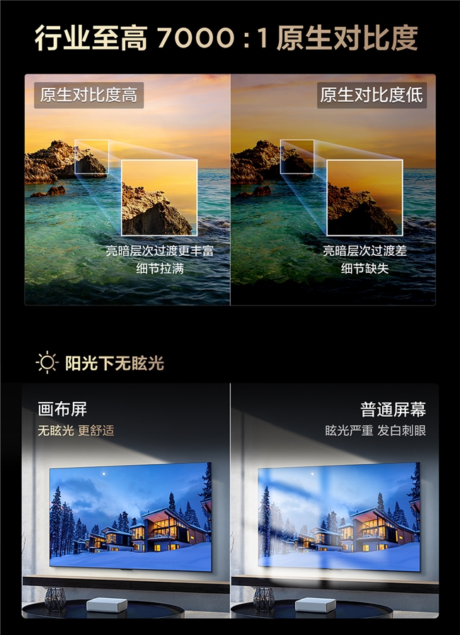 值得一提的是,“画布屏”表面应用了纳米级树脂涂层,形成了独特的微结构。这一设计能有效增加环境光的漫反射,大幅减少眩光干扰。这意味着,即使在白天明亮的客厅中,用户也无需刻意拉上窗帘,即可享受色彩饱满、细节清晰的画面,实现了可靠的抗眩光效果,确保了沉浸式观影不被打断。