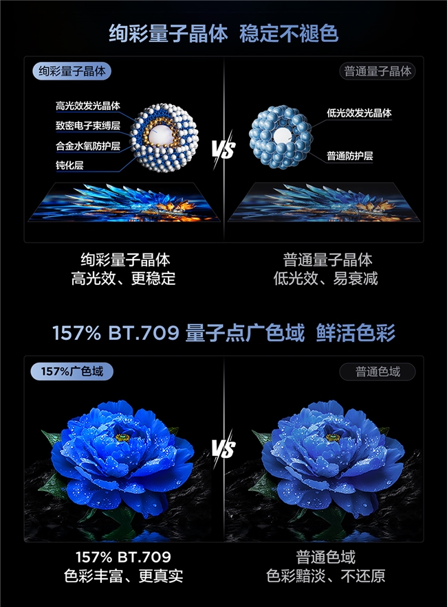 历经十余年八次迭代的量子点Pro 2025技术,为TCL 98Q6L带来高达157% BT.709的广色域覆盖。色彩不仅鲜艳丰富,更实现了精准还原,而且能长久保持稳定不褪色,确保了画质的持久生命力。