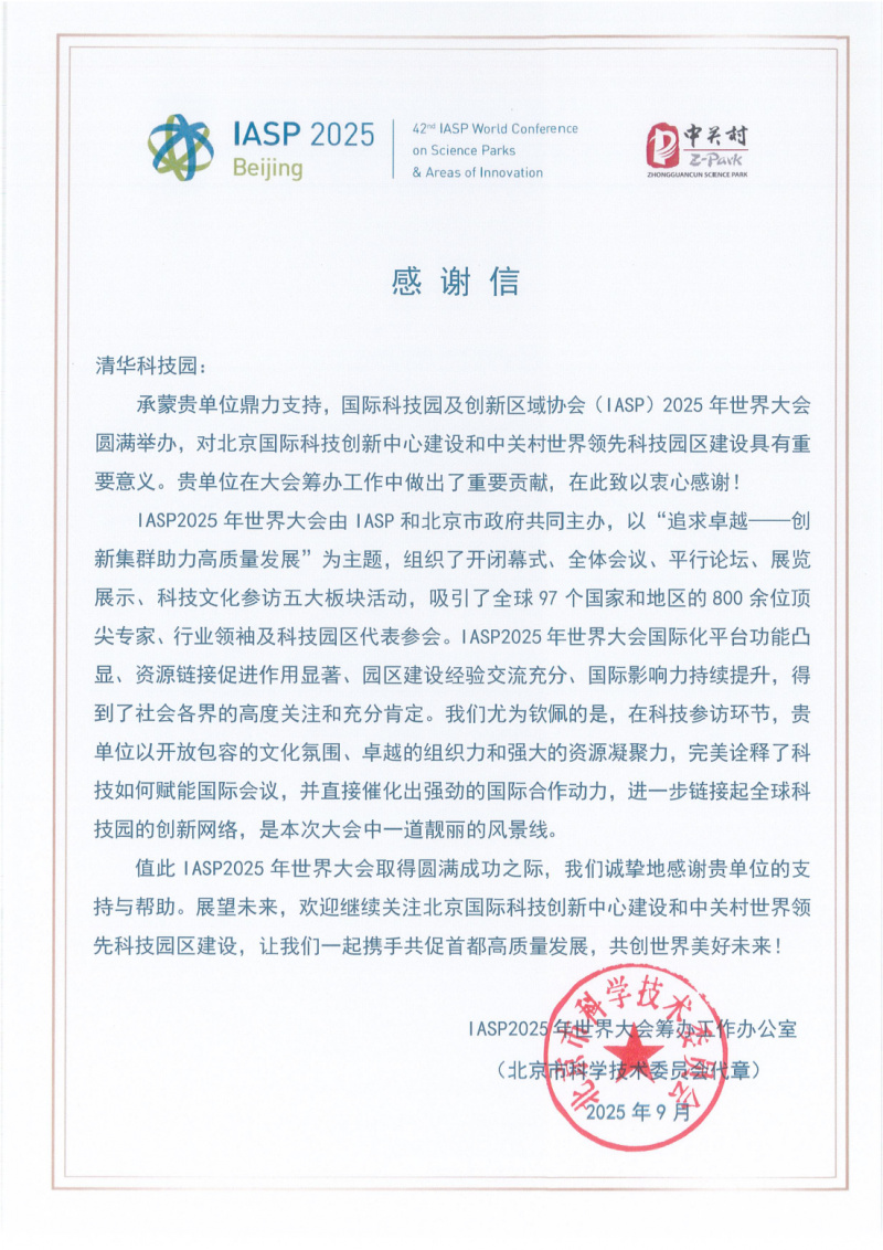 正如IASP在感谢信中所提:“贵单位以开放包容的文化氛围、卓越的组织力和强大的资源凝聚力,完美诠释了科技如何赋能国际会议。”这份肯定,既是对过去工作的总结,更是对未来征程的激励。启迪之星将继续落实赋能园区科协高质量发展项目要求,在北京市科委、市科协创新服务中心指导下,深耕创新服务,为更多科技企业搭建通向世界的桥梁!