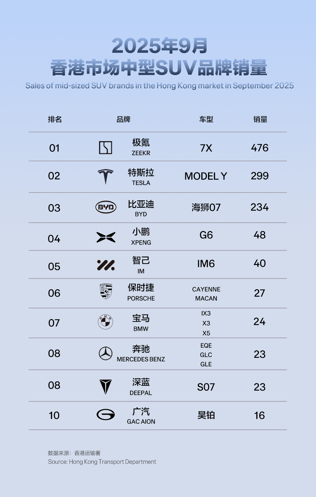近日,根据香港运输署公开数据显示,极氪旗下豪华大五座SUV极氪7X,在香港市场交付首月即刚刚过去的9月力压特斯拉Model Y,夺得中型SUV销量冠军,展现出强劲的全球化产品竞争力。