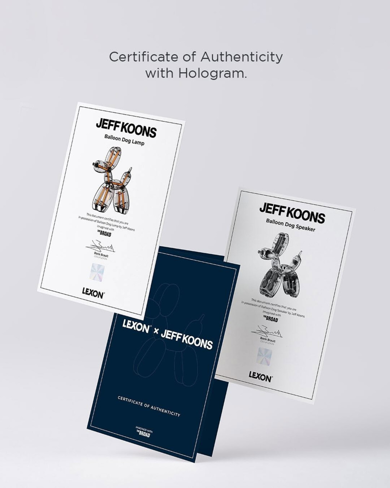 这两款产品的 “艺术身份”,藏在每一处经过反复打磨的细节里:每一件的前爪位置,都采用激光微雕技术复刻 Jeff Koons 的亲笔签名,纹路细腻到能看清笔锋转折,绝非普通联名的印刷贴纸;随箱附赠的收藏证书更具分量 —— 不仅印有唯一识别编号,还带有 The Broad 博物馆的全息防伪印章与官方授权标识,意味着它不是简单的 “衍生周边”,而是经博物馆认证的 “艺术延伸作品”,与展柜里的《气球狗》共享同一段创作脉络。