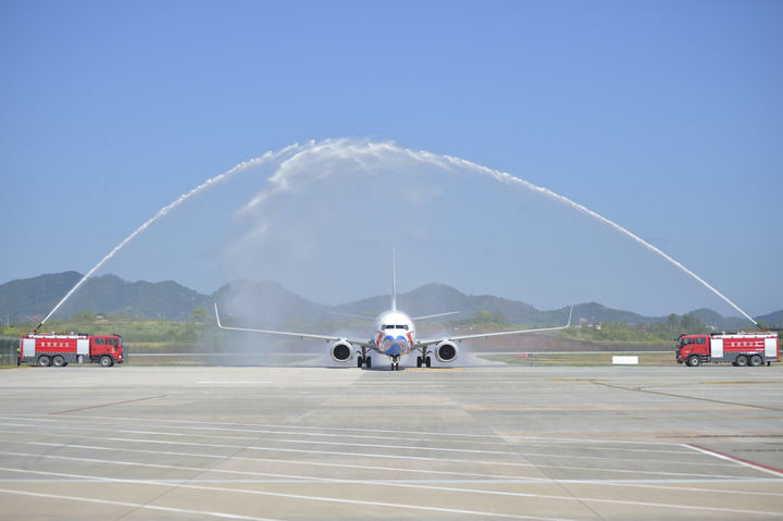 2025年9月28日,由中国国际航空执飞的北京大兴至瑞金航班飞抵瑞金机场后通过“水门”。新华社发(杨鑫 摄)