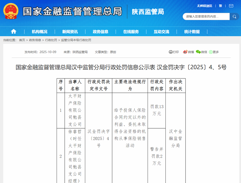 记者注意到,勉县支公司的罚单并非孤例。今年以来,太平财险多家分支机构因类似违规行为接连受罚。
