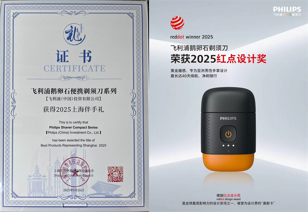 这份在极端环境中经受过考验的硬核实力和出色表现,不仅赢得了专业航海家的信赖,也获得了众多消费者与市场的认可。在刚刚结束的 2025 年度“上海伴手礼”评选活动中,飞利浦鹅卵石Pro剃须刀凭借科技创新与设计美学脱颖而出,成功斩获“2025 上海伴手礼”称号,受到上海市消保委认可,成为最能代表上海温度与科技实力的伴手礼之一。不仅如此,鹅卵石剃须刀凭借产品突破性与设计力还斩获了2025德国红点设计奖以及2025 iF设计奖 两大国际权威认可,“双冠王”实至名归。