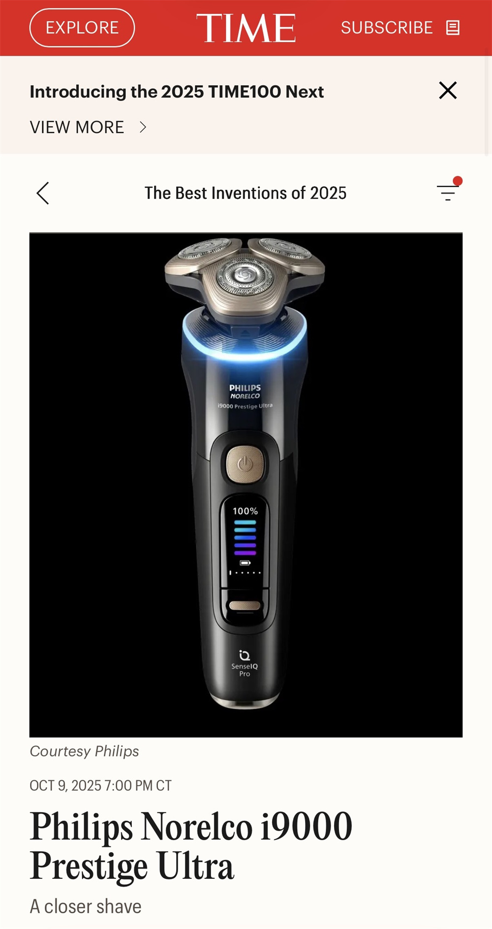 而在刚刚公布的美国《时代》杂志“2025年度最佳发明榜单”中,飞利浦电动剃须刀家族的另一款明星产品——飞利浦旋护式新9系剃须刀Ultra凭借SenseIQ Pro等AI创新科技及卓越的产品功能,实力登榜,成为300件入选产品中唯一的剃须刀产品。在此之前,飞利浦旋护式新 9 系剃须刀、飞利浦旋风 Pro 剃须刀也荣膺2025德国红点设计奖,受到国际市场的关注与认可。作为全球销量第一的电动剃须刀品牌,飞利浦男士理容自1939 年发明世界上第一把旋转式电动剃须刀,80余年来始终在技术上不断创新突破,为消费者带来卓越的剃须体验。