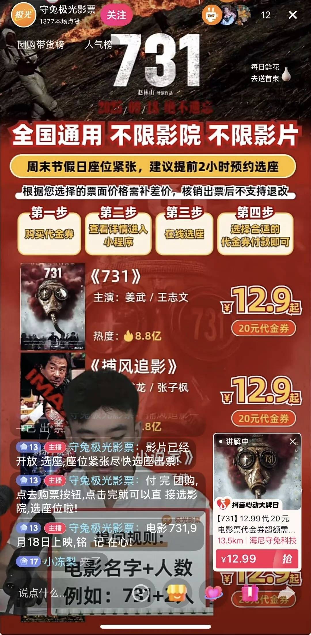 其一,本次合作实现了「抖音心动大牌日-城市大牌」在电影票务领域的首次深度落地,重构了行业营销路径。 活动通过“站外IP势能导入”与“站内流量生态转化”的双轮驱动,构建了可复用、可扩展的品效合一模型。“守兔”作为特惠票务领域的代表性品牌,将其在站外积累的品牌认知与用户信任有效引流至抖音平台;而抖音则通过达人直播矩阵、热点内容推送、交易链路闭环等生态能力,实现了从声量引爆到销售转化的全流程贯通。这种“外引内聚”的联动机制,不仅提升了营销效率,也为线上线下融合型业务提供了可借鉴的运营范式。