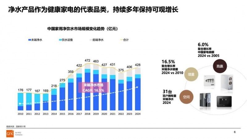 过去十年,净水设备从厨下默默无闻的过滤工具,逐渐演变为厨房台面的智能中心。根据GfK数据,2024年末端净水销量相比2010年复合增长率达到16.5%。