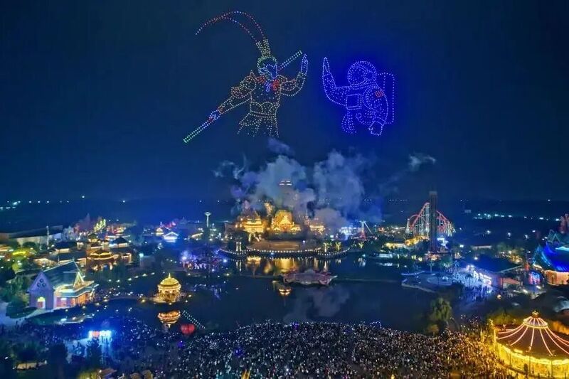 淮安西游乐园“千机共舞·西游星河”,根据节日主题,定制无人机专属表演内容。在刚刚过去的国庆中秋假期,推出“家国团圆”主题无人机秀,1600架无人机同步升空,组成“我爱你中国、盛世华诞、璀璨中国、闪耀中国红”等文字与造型,为市民游客带来“空中诗篇”般的视觉盛宴。