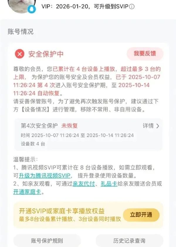 从该网友发布的截图可见,其腾讯视频VIP账号累计在4台设备上播放,超出了平台规定的最多3台登录上限,已于10月7日第4次进入账号安全保护期,将持续至10月14日自动恢复。