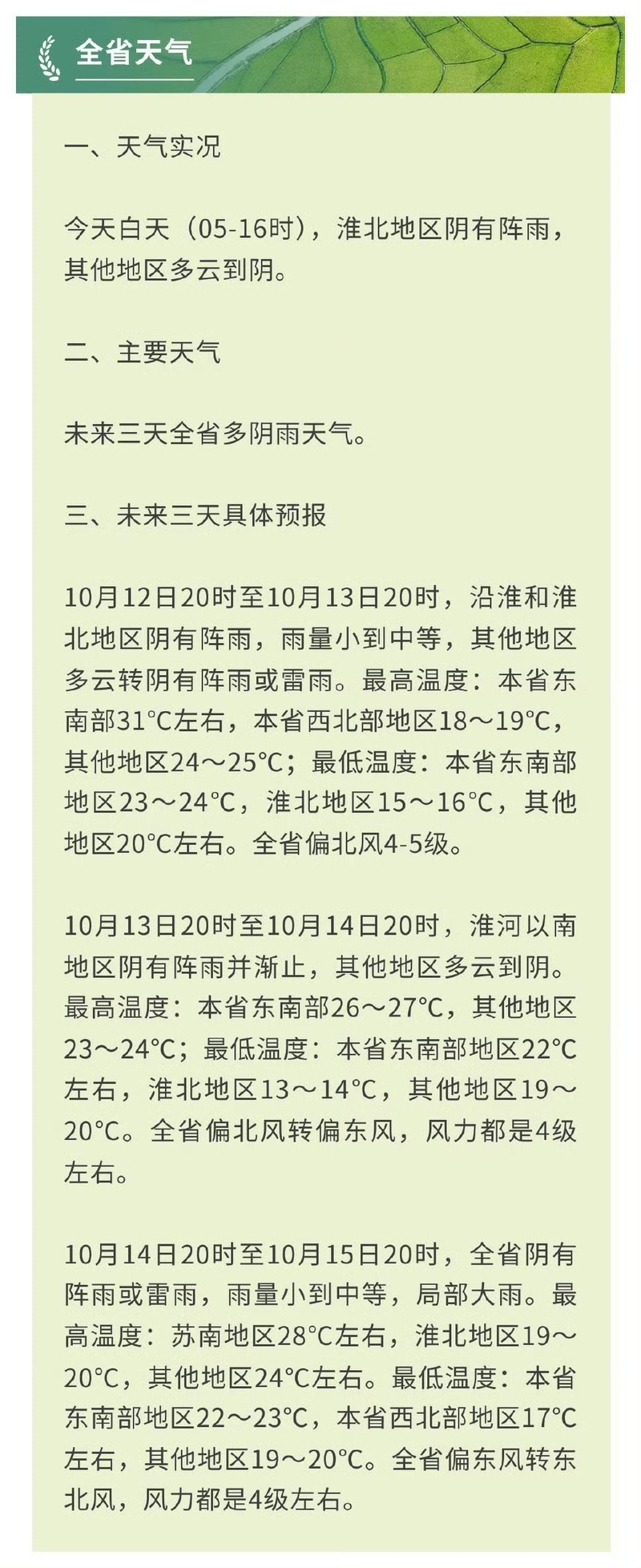 10月12日20时到13日20时,沿淮和淮北地区阴有小到中雨,其他地区多云转阴有阵雨或雷雨,刮起4~5级偏北风。气温上,东南部最高温达31℃左右,西北部却只有18~19℃,温差达13℃,最低温也呈现东南部23~24℃、淮北15~16℃的显著差距。