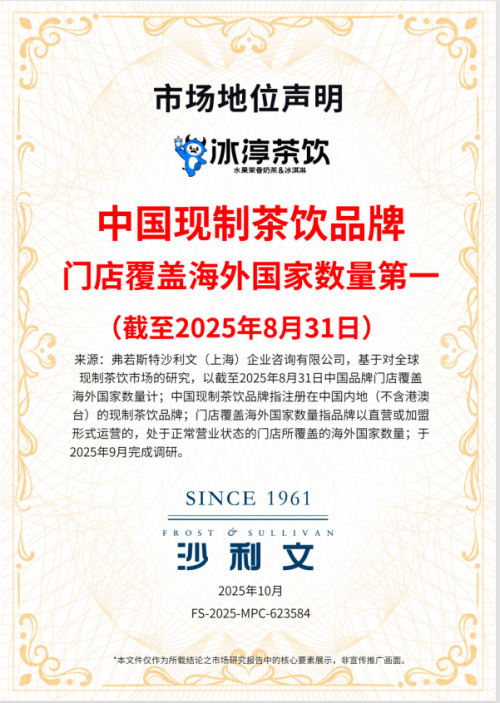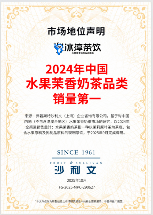 中国新锐茶饮品牌冰淳茶饮今日宣布,其已获得全球著名增长咨询公司弗若斯特沙利文的两项权威认证:“水果茉香奶茶品类销量第一” 与 “中国现制茶饮品牌门店覆盖海外国家数量第一” 。此次双认证的获得,标志着冰淳茶饮以“超级大单品”深耕核心市场的战略取得显著成效,同时其全球化布局也已跻身行业前沿。