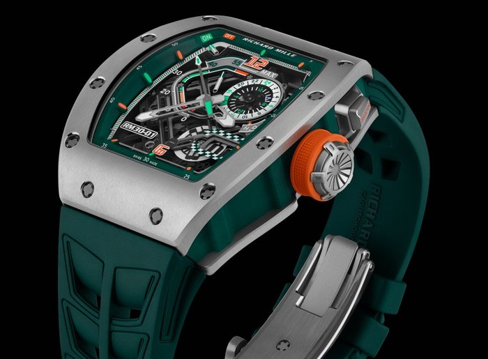 最早的RM 001 陀飞轮腕表首次将钛合金与实验性底板引入陀飞轮机芯,材料不再只是装饰,而是功能与稳定性的核心。随后的设计融入赛车元素,包括镂空机芯、开放式表盘布局、工业风格表冠与按钮,使腕表具备强烈辨识度与动态感。
