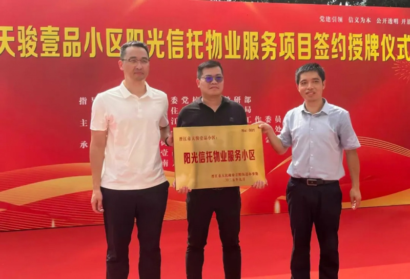 仪式当天,福建省委党校张义祯副教授、晋江市住建局城建项目中心尤祖鸿主任共同向天骏壹品小区授予编号“001”的“阳光信托物业服务小区”牌匾,天骏壹品小区成为福建省第一个信托制小区。