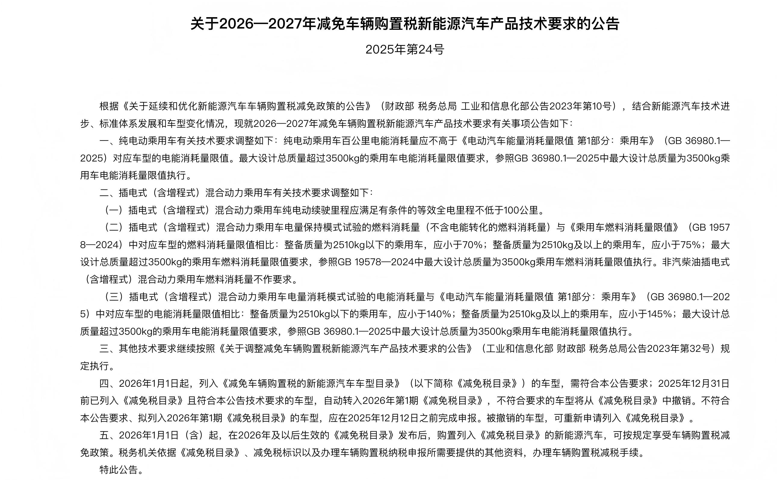 《关于2026—2027年减免车辆购置税新能源汽车产品技术要求的公告》(下称公告)近日发布,对纯电动乘用车和插电式(含增程式)混合动力乘用车有关技术要求进行了调整。公告将于2026年1月1日起正式实施。