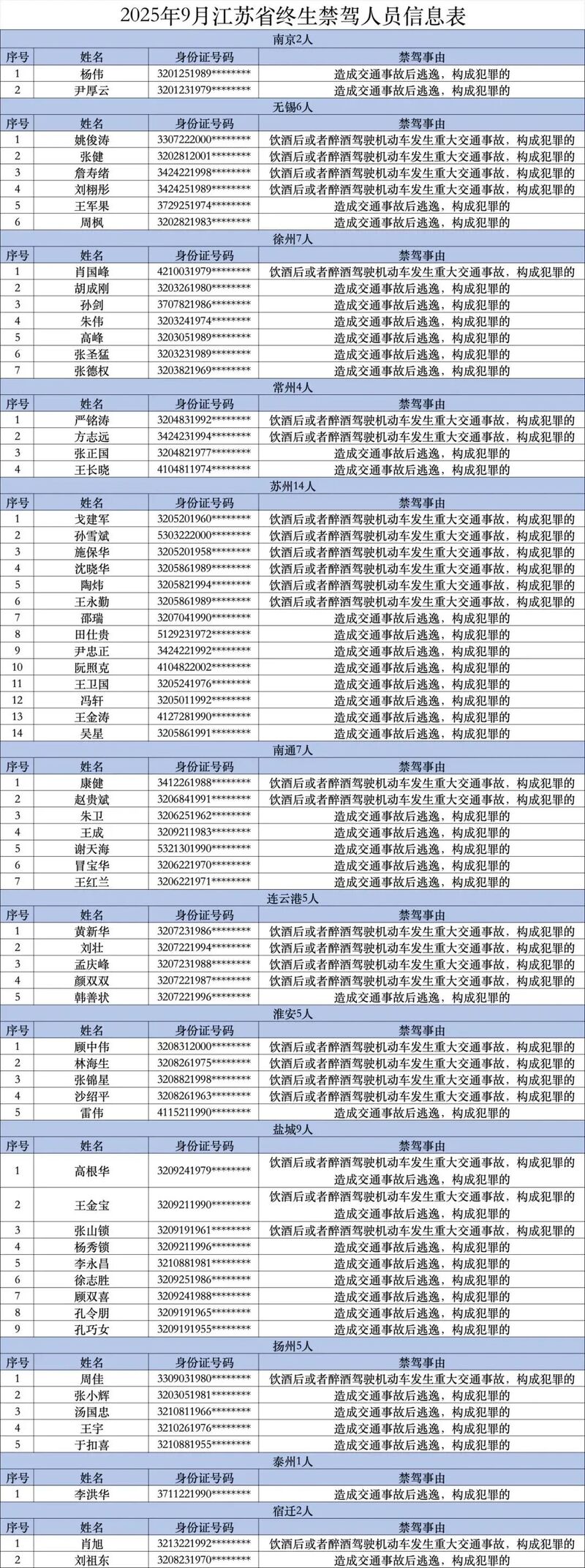 为全力以赴防风险除隐患、保安全保畅通,努力以高水平安全保障高质量发展。今年以来,江苏交警持续开展“五大曝光”行动,加大对严重交通违法犯罪行为的曝光力度,充分发挥教育引导、警示震慑作用。据统计,2025年9月,全省共计67人被依法吊销机动车驾驶证,且终生不得重新申领。现将名单予以曝光。